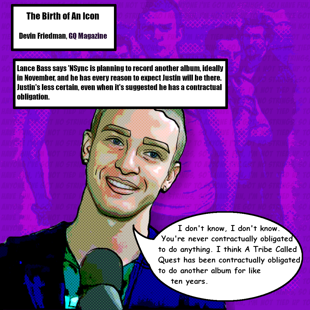 - 1) This graphic features content from the September 2004 issue of GQ UK, which was on sale in August. The original article is not currently available via GQ’s website or public archives. A transcribed copy of the interview was located on a fan-hosted website. The quote attributed to Justin Timberlake has been corroborated by an archived MTV News update published the same year.