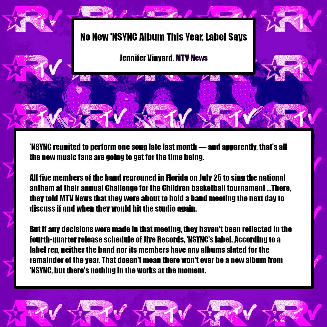 - 2) MTV News reported that *NSYNC had reunited to perform the national anthem at their annual Challenge for the Children event, but no new music was planned. Although the group mentioned an upcoming band meeting to discuss future recording, Jive Records confirmed that no releases were scheduled for the remainder of the year.