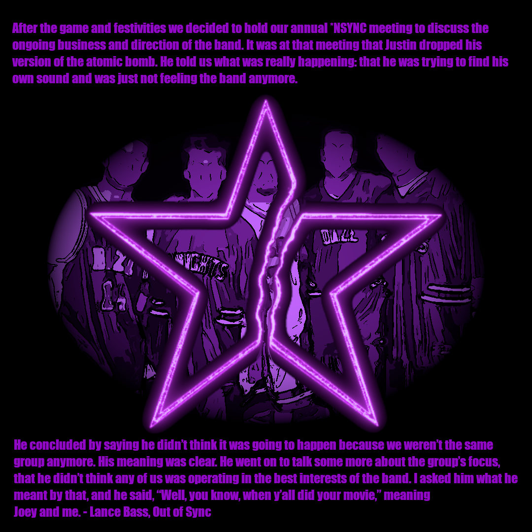4) In chapter 6 of his memoir, Lance Bass recalls the group meeting in which Justin Timberlake announced his departure from *NSYNC. While Bass does not specify a date, the official press release confirms that the 2004 Challenge for the Children event took place from July 23rd to July 25th. Based on that timeline and remarks from other group members in press coverage, the meeting likely occurred on Monday, July 26th.