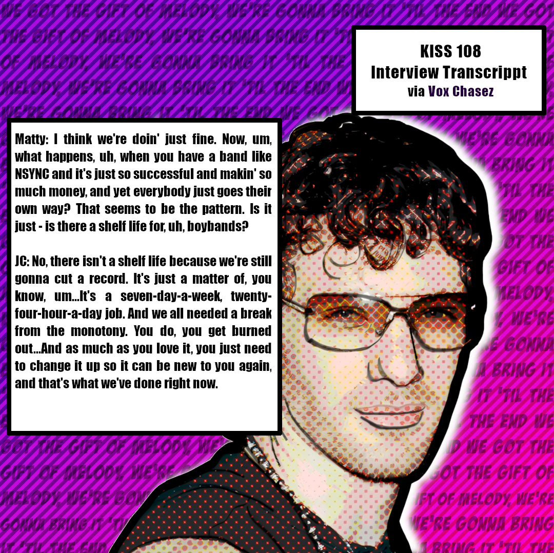 - 2) The Vox Chasez fan site also published a transcript of a radio interview with KISS 108 Boston from 6/17/04.
