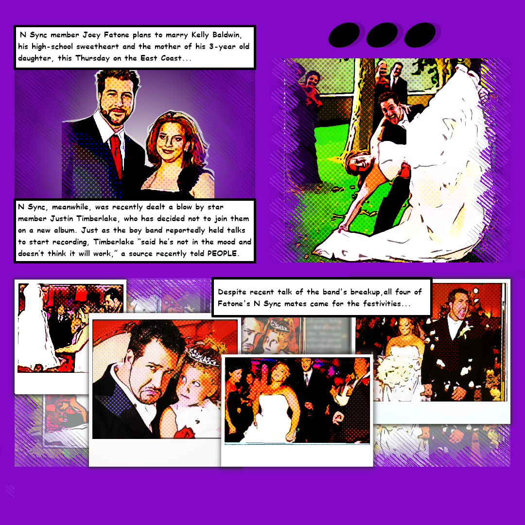- 1) People Magazine published two features about Joey Fatone’s wedding. On September 8, the People website published a brief feature about Joey Fatone’s upcoming wedding and mentioned *NSYNC’s recent breakup. (Upper left) Later in the month, the September 27th issue of People Magazine featured a two-page story about Joey Fatone’s wedding, noting that all 5 band members were present at the event. (Upper right, bottom collage)