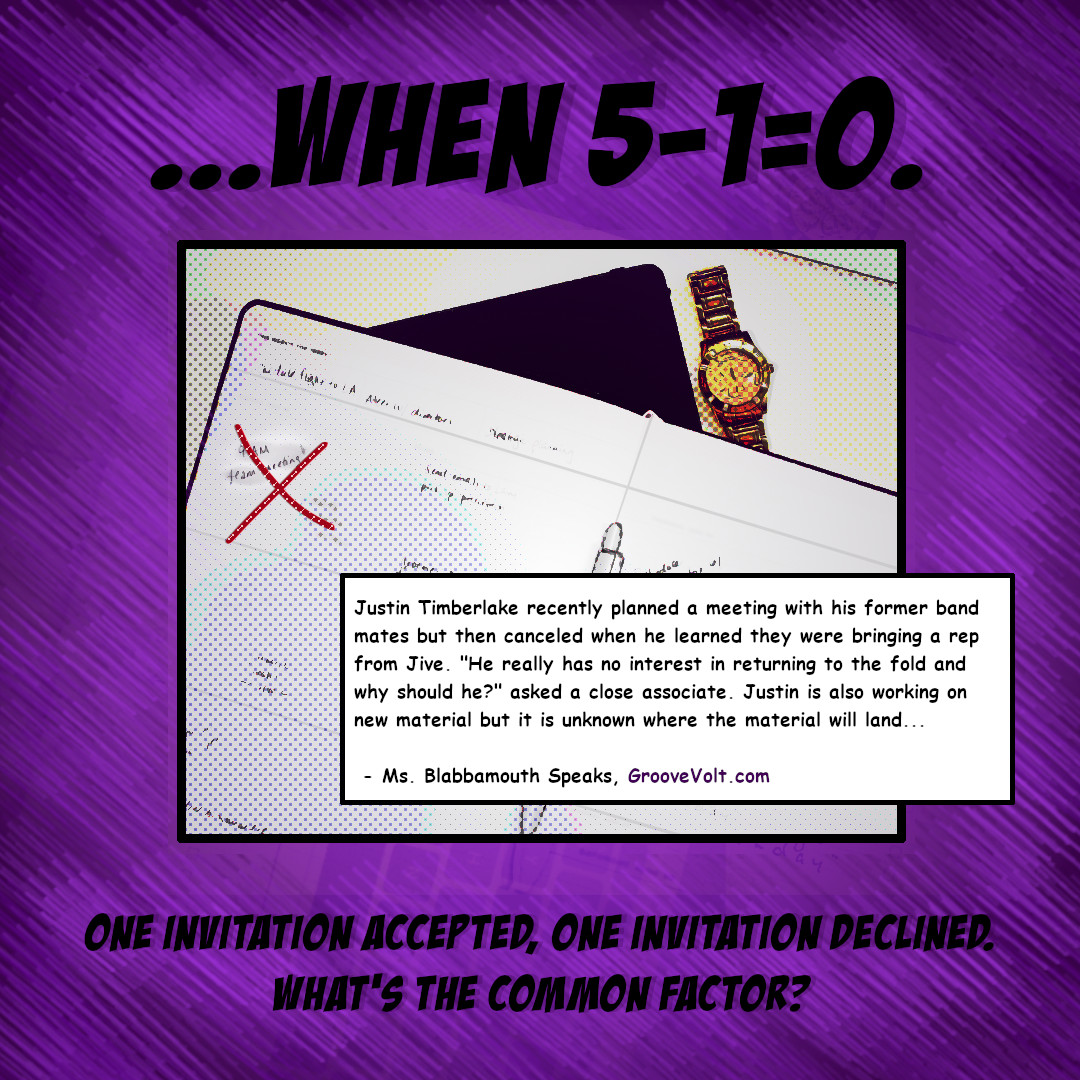 - 3) A Groovevolt.com gossip post claims that Justin Timberlake planned a meeting with the rest of *NSYNC but canceled when he learned that a representative from Jive Records would be present.